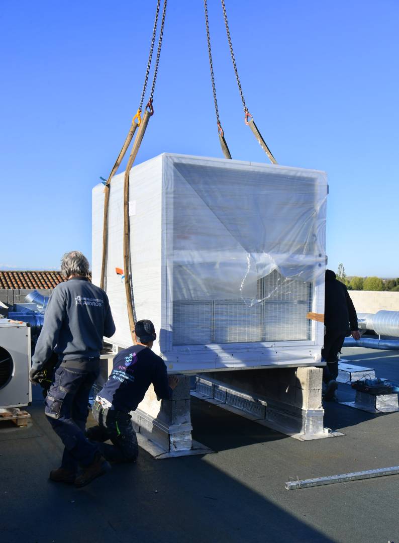 Le levage s’effectue de manière progressive et contrôlée, en tenant compte des effets du vent, de la hauteur de levage et de la proximité des structures. Une fois la charge en élévation, elle est guidée par les équipes en toiture, qui assurent son positionnement précis dans la zone prévue. L’opération nécessite une grande maîtrise pour éviter tout balancement ou rotation intempestive.
